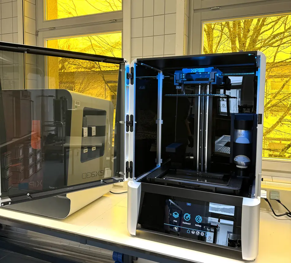 Der neue Nexa von Nexa3D ist einer unserer SLA (StereoLithography Apparatus) Drucker. Das Besondere an diesem Druckverfahren ist, dass der Ausgangwerkstoff, ein Resin (Harz), flüssig ist und durch UV-Strahlung härtet. Aufgrund dieser Umstände entsteht das Bauteil von oben nach unten und es sieht es so aus, als würde es einfach aus dem Resin herausgezogen werden.