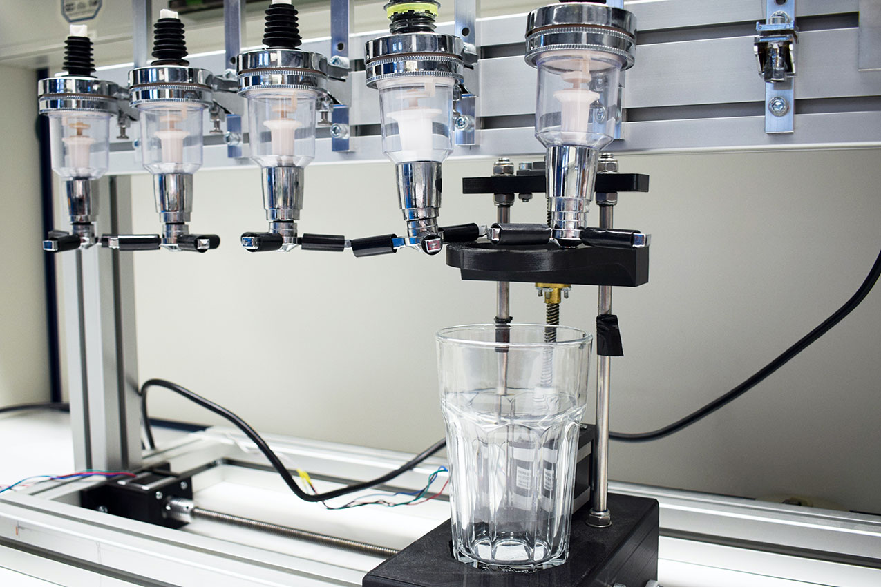An der Schneidestation für Zitrusfrüchte bewegen zwei Motoren einen Stempel durch einen Messerblock und schneiden die eingelegten Früchte. Am Ende kann die Mischung mit Hilfe eines Rührwerks gerührt werden. Der Rührer taucht in das Glas und mischt den Cocktail. Dann fährt er wieder aus dem Glas und der Cocktail wird gemischt!