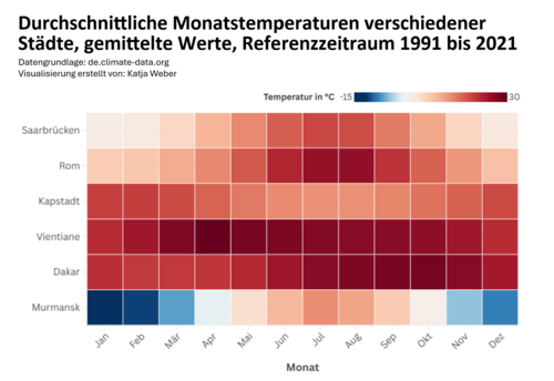 Bei dieser Grafik handelt es sich um eine Heatmap. Ein Kästchen korrespondiert mit der monatlichen Durchschnittstemperatur der auf der y-Achse aufgeführten Städte, wobei die Färbung des Kästchens den entsprechenden Wert kodiert. Besonders ist, dass der Temperaturverlauf hier im Gegensatz zu anderen Darstellungen wie beispielsweise den gängigen Klimadiagrammen nach Walter & Lieth oder allgemein von Verlaufsdiagrammen nicht kontinuierlich, sondern als diskrete Werte dargestellt wird.