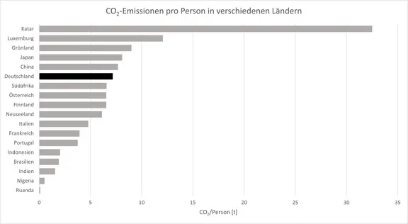 Balkendiagramme gehören gemeinsam mit Säulendiagrammen zu den am häufigsten verwendeten Diagrammtypen. Die Länge der Balken codiert hierbei die Quantität, in der ein Untersuchungsmerkmal vorliegt, hier zum Beispiel der CO2-Ausstoß pro Person in verschiedenen Ländern. Um die Übersichtlichkeit des Diagramms zu verbessern, wurden die Säulen nach absteigender Größe sortiert. Deutschland wird zusätzlich durch eine dunklere Einfärbung hervorgehoben (Verwendung von Akzentfarben). Dies erlaubt den Betrachtern an die sich diese Visualisierung in erster Linie richtet schnell einzuordnen, wo sie selbst im Vergleich stehen.