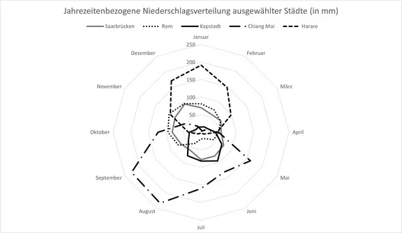 Netzdiagramme bestehen aus mehreren Achsen, die sowohl gleich als auch unterschiedlich skaliert sein können und gemeinsam das namensgebende „Netz“ aufspannen. In diesem Netz werden anschließend die Datenpunkte platziert (hier beispielsweise basierend auf Monat und Niederschlagsmenge) und zu den charakteristischen Polygonen verbunden. Verwendet man ein Netzdiagramm, um mehrere Datensätze zu vergleichen, kann man zwischen diesen visuell durch verschiedene Linienarten oder Einfärbung differenzieren.