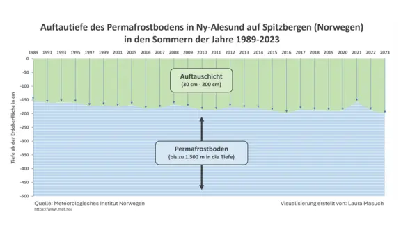 Die beigefügte Abbildung veranschaulicht anhand eines Verlaufsdiagramms die Veränderung der Auftautiefe von Permafrostböden zu verschiedenen Zeitpunkten. Die Skalierung der y-Achse wurde bewusst invertiert, um die zunehmende Auftautiefe visuell nachvollziehbar darzustellen. Dadurch wird die Veränderung der Auftautiefe im Betrachtungszeitraum intuitiv erfassbar gemacht.