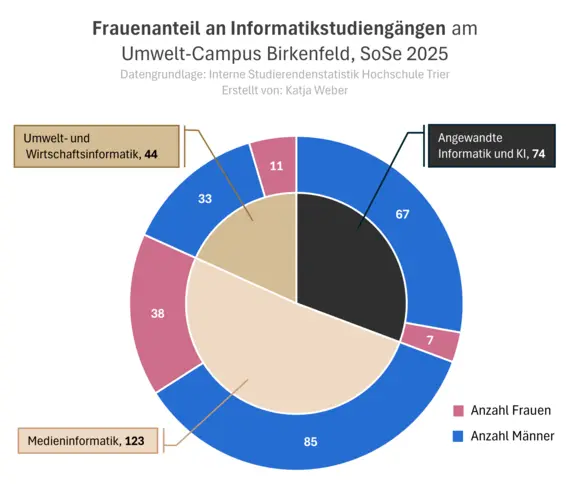 Hier wurde ein Kreis-in-Kreis beziehungsweise Kreis-in-Donut Diagramm verwendet, um die Verteilung von Studierenden auf Informatikstudiengänge am Umwelt-Campus darzustellen. Da hier zwei verschiedene Verteilungen – die Verteilung von Studierenden auf die Studiengänge insgesamt und die Verteilung von weiblichen und männlichen Studierenden auf die Programme selbst – veranschaulicht werden sollten, wurde das innere Kreisdiagramm durch Zufügen eines äußeren Rings weiter aufgebrochen, um beide Verteilungen gleichzeitig und anschaulich zu visualisieren.