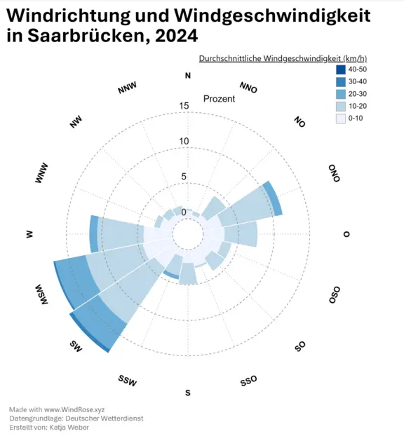 Bei diesem Windrose-Diagramm handelt es sich um eine besondere Form des Netz-Diagrammes. Netz-Diagramme eignen sich auch gut dazu, Richtungsinformationen (hier: Windrichtung) zu codieren. Durch Einfärben der Balken wird außerdem eine Aussage über den Anteil verschiedener Windgeschwindigkeiten an den jeweiligen Windrichtungen gemacht.