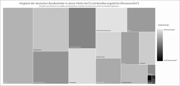 Eine Treemap ist eine grafische Darstellung von hierarchischen Daten mithilfe von verschachtelten Rechtecken. Dabei repräsentiert jedes Rechteck ein Element der Hierarchie, wobei die Größe eines Rechtecks für einen quantitativen Wert (z. B. Umsatz, Anzahl, Fläche) steht. Zudem besteht die Möglichkeit, mittels Farbwahl oder Graustufen einen weiteren Parameter darzustellen (z.B. Bevölkerungsdichte). Hierbei ist wie immer darauf zu achten, dass die Grafik barrierenfrei und auch für Betrachter mit Farbfehlsichtigkeit gut lesbar bleibt.