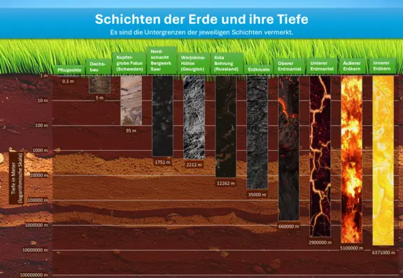 Die beigefügte Abbildung kombiniert verschiedene Diagrammformen zur Darstellung geologischer Tiefenverhältnisse. Eine schematische Halbkugel visualisiert den Aufbau des Erdinneren mit den entsprechenden Schichten. Ergänzt wird dies durch ein Säulendiagramm, das eine Auswahl realer Tiefenbohrungen innerhalb der obersten Erdschicht zeigt. Aufgrund der hohen Spannweite der Tiefenangaben wurde eine logarithmische Skala verwendet, um die Vergleichbarkeit der dargestellten Bohrungen zu gewährleisten.