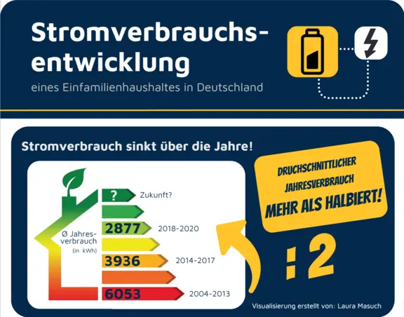 In dieser Abbildung wird die Entwicklung des Stromverbrauchs in einem Einfamilienhaushalt vorgestellt. Die zugrundeliegenden Daten wurden dazu zunächst aufbereitet und dann so reduziert, dass die Infografik eine klare Aussage tätigen kann. Grafisch ansprechend und thematisch passend wird die Visualisierung durch Verwendung typischer mit Strom assoziierter Symbole wie der Batterie und dem Blitz, einer farblichen Codierung des Balkendiagramms die an die typische Energieeffiziensklassen-Grafik erinnert, und der Reduzierung von Text auf die Kernaussagen.