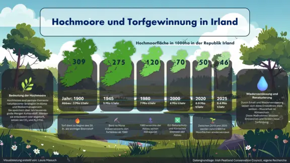 Die Infografik zeigt die Entwicklung der Hochmoorflächen und des Torfabbaus in der Republik Irland von 1900 bis 2025. Zur Darstellung der Flächenentwicklung werden stilisierte Irland-Karten verwendet, deren Größe proportional zur jeweils verbliebenen Hochmoorfläche skaliert ist. Das bedeutet: Je kleiner das Symbol, desto stärker ist der Rückgang der Hochmoorfläche im entsprechenden Zeitraum. Ergänzend sind die Werte des Torfabbaus als Vergleichsgröße dargestellt. Die Kombination beider Größen macht den Zusammenhang zwischen der Intensität des Torfabbaus und dem Verlust der Hochmoorflächen deutlich sichtbar. In begleitenden Infokästen werden unter anderem historische Meilensteine der Torfgewinnung erläutert, die den Zusammenhang zwischen Nutzung, Landschaftswandel und heutigen Renaturierungsmaßnahmen verdeutlichen.