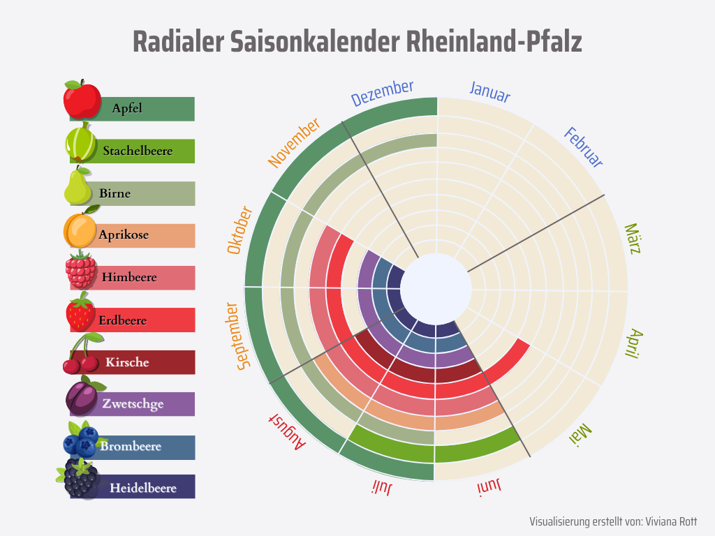 Hier wurde ein einfaches Kreisdiagramm verwendet, um eine Verteilung darzustellen. Was diese Visualisierung zu einem Piktogramm macht, ist dass die einzelnen Flächen nicht einfach nur farbig codiert wurden, sondern mit Bildern hinterlegt, die sich den verschiedenen Arten von Flächennutzung zuordnen lassen. Das Diagramm wird dadurch nicht nur visuell ansprechender, sonder auch intuitiver zu interpretieren.