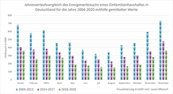 Die beigefügte Abbildung zeigt ein Piktogramm zum Stromverbrauch eines durchschnittlichen Einfamilienhaushalts in Deutschland über einen mehrjährigen Zeitraum. Um eine verständliche und prägnante Darstellung zu ermöglichen, wurden die zugrunde liegenden Daten aggregiert – unter anderem durch die Mittelung über mehrere Jahre. Die grafische Aufbereitung mit Symbolen und Illustrationen unterstützt die Vermittlung zentraler Trends und Entwicklungen im Verbrauchsverhalten.