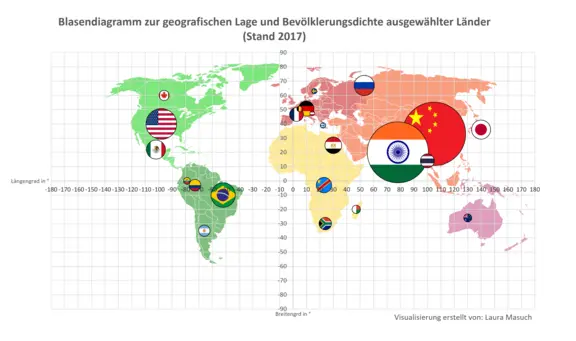 Dieses Piktogramm geht bereits in Richtung Geovisualisierung, da die X- und Y-Koordinaten für die räumliche Lage der Länder stehen (Zentrumskoordinaten) und die Blasen dementsprechend eine räumlich relativ korrekte Positionierung zu einander aufweisen. Die Größe der Blasen kodiert zusätzlich die Bevölkerungsgröße der Länder. Wie bei dem Kreisdiagramm wurde das Blasendiagramm hier durch Grafiken, die jeweiligen Landesflaggen, ergänzt, um die Lesbarkeit und Zuordnung zu verbessern.