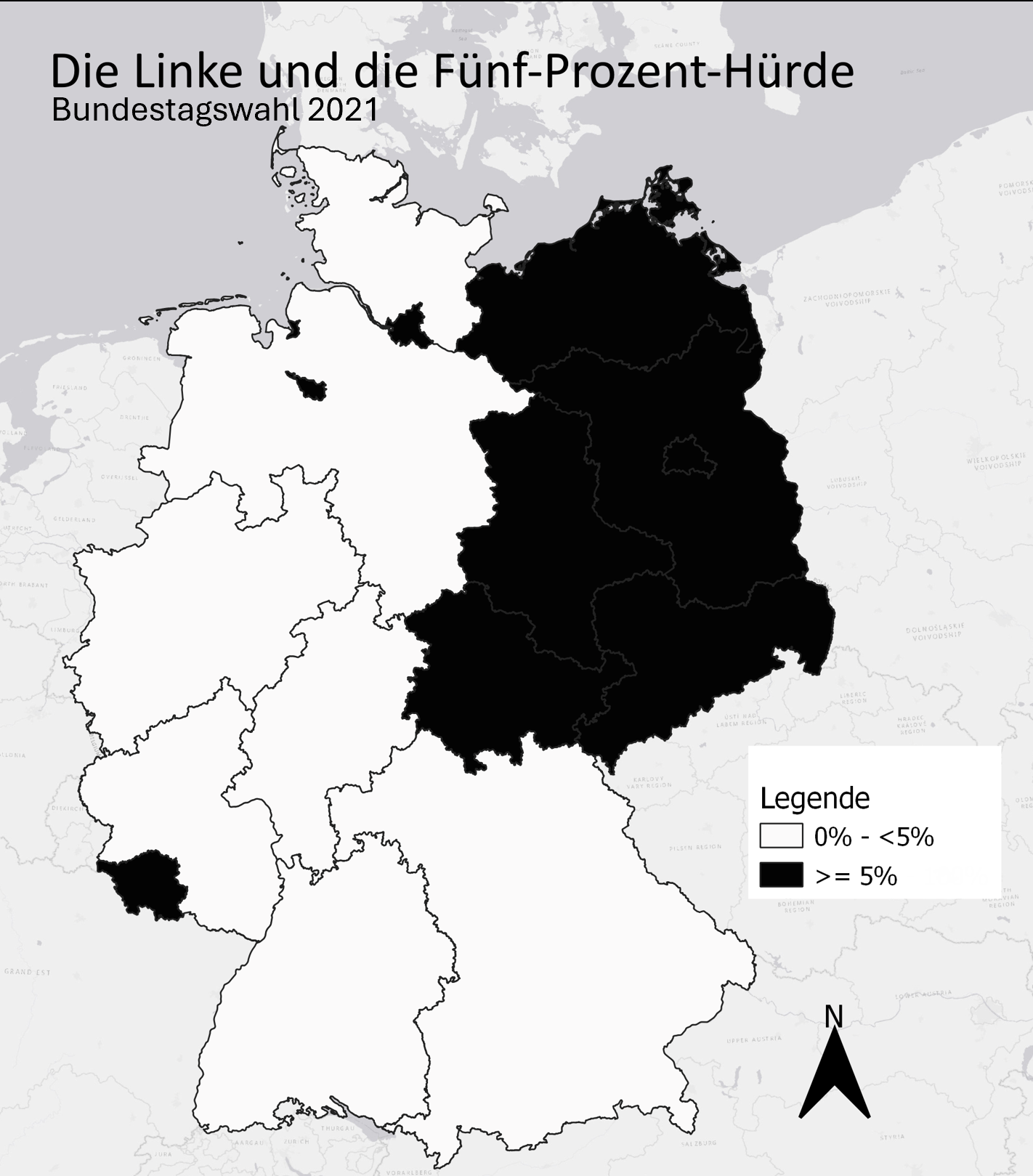 Auch im Bereich der Geovisualisierung ist es möglich, Abbildungen bewusst suggestiv zu gestalten. Hier wurde dies durch Binarisierung erreicht, also das Aufteilen der zugrundliegenden Daten in zwei Klassen. Intuitiv gehen wir als Betrachter davon aus, dass diese gleich groß sind, oder dass die Grafik sich mit einer Fragestellung beschäftigt, die nur zwei mögliche Antworten hat. Letzteres ist im Fall dieses Kartogramms eigentlich der Fall: Hat die Linke in einem gegebenen Bundesland die 5%-Hürde geschafft? Das Problem hier lässt sich an der Legende ablesen. Nicht nur haben die beiden Klassen stark verschiedene Breiten (was in diesem Fall noch zu entschuldigen wäre), sondern die Farben sind auch gegenüber der eigentlichen Kartengrafik genau invertiert. Eigentlich müsste also Schwarz mit unter 5% korrespondieren und Weiß mit 5% und mehr. Durch diesen kleinen Tausch wird der komplette Sachverhalt genau umgekehrt dargestellt.