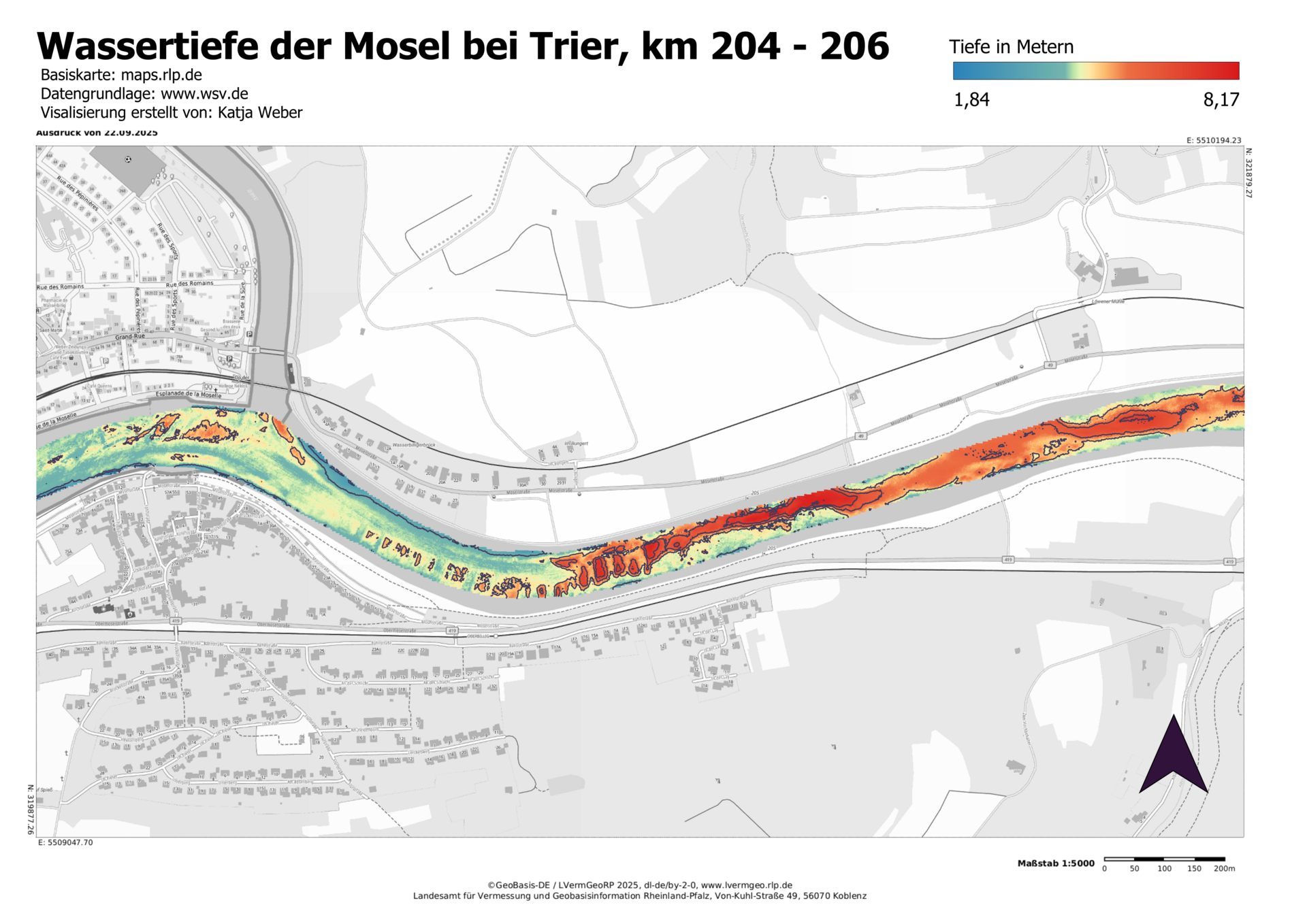 Auch bei dieser Karte handelt es sich um eine bathymetrische Karte, also eine Karte, die die Tiefe an verschiedenen Stellen innerhalb eines Gewässers zeigt. Dazu wurde im Gegensatz zu oben hier nicht der Isobathen-Effekt, sonder das SAGA-Plugin gemeinsam mit dem Rasterize-Tool verwendet. Mit deren Hilfe lässt sich in QGIS eine Karte erstellen, die die Tiefendaten in Form einer XYZ-Textdatei farblich kodiert visualisiert.