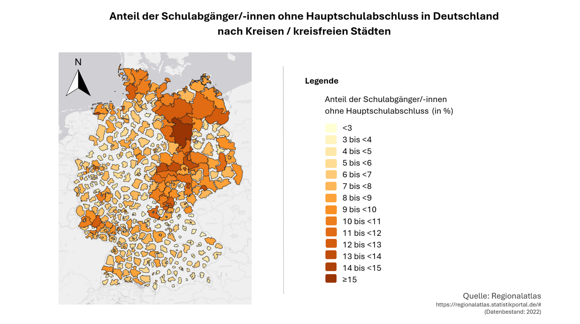 Dieser Kartogramm-Typ wird als nicht-zusammenhängendes Kartogramm bezeichnet. Die betrachteten geografischen Elemente, hier die Landkreise und kreisfreien Städte, müssen nicht mit ihren Nachbarn verbunden bleiben und können deshalb in Abhängigkeit eines metrisch skalierten Merkmals wachsen oder schrumpfen, ohne, dass sich ihre äußere Form verändert. Das hier dargestellte Merkmal, der Anteil an Schulabgängern, ist zur Verbesserung der Lesbarkeit zusätzlich auch über die Farbe codiert, da es für den Betrachtenden schwer ist, die Größen allein bestimmten Prozentzahlen zuzuordnen.