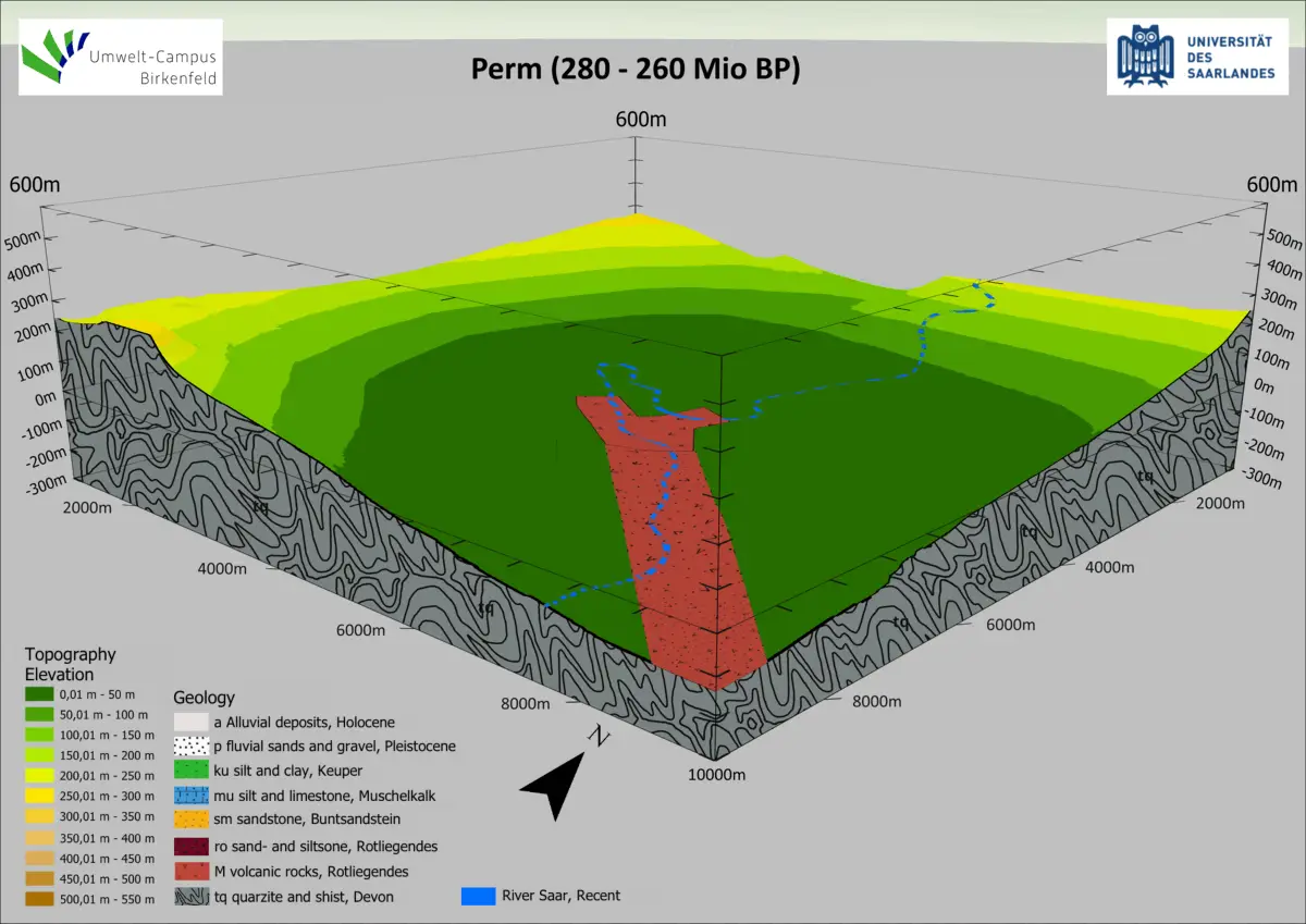 Ein Blockdiagramm ist eine schematische, dreidimensionale Darstellung eines Ausschnitts der Erdkruste, die sowohl die Geländeoberfläche als auch den geologischen Untergrund zeigt. Werden zu unterschiedlichen geologischen Epochen Blockdiagramme der (rekonstruierten) Landschaften erstellt können diese -wie in unserem Fall- als animiertes multiGIF die Landschaftsentwicklung über geologische Zeiträume ansprechend und verständlich visualisieren. Die Beispieldarstellung visualisiert die Entwicklung der Saarschleife über die letzten 300 Mio Jahre.