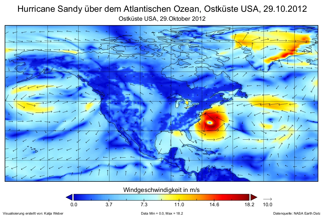 Panoply ist eine von NASA entwickelte Software, die zur Visualisierung meteorologischer und klimatologischer Parameter wie Boden- und Wassertemperatur, Niederschlagsverteilung, oder in diesem Fall Windrichtung und Windgeschwindigkeit dient. Mithilfe der Möglichkeit zum Erzeugen kleiner Animationen lässt sich mit Panoply auch die Veränderung besagter Parameter über die Zeit hinweg darstellen. Eine offizielle Zusammenstellung von Anleitungen zur Verwendung des Tools gibt es hier, den verwendete Datensatz inklusive Erklärung gibt es hier.