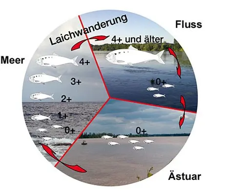 Der Maifisch ist ein anadromer Wanderfisch aus der Familie der Heringe, d.h. er verbringt den größten Teil seines Lebens im Meer, laicht aber im Fluss. Im späten Frühjahr wandern die erwachsenen Maifische in großen Schwärmen viele hundert Kilometer die Flüsse hinauf, um sich während der warmen Nächte (April-Juli) auf kiesigen Flussabschnitten fortzupflanzen. Nach nur etwa vier Tagen schlüpfen die kleinen Maifische aus den Eiern und driften während der Sommermonate in Richtung Flussdelta. Noch bevor sie ihr erstes Lebensjahr vollendet haben, wandern die mittlerweile 10-15 cm langen Jungtiere ins Meer und der Lebenszyklus beginnt von Neuem.