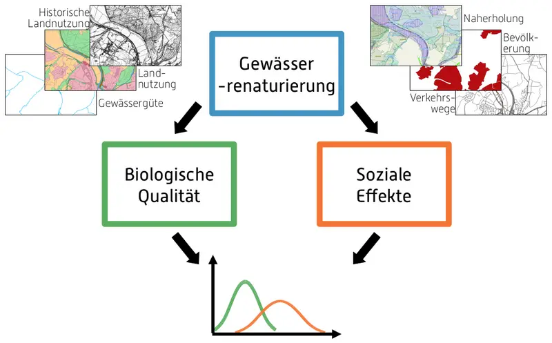 Renaturierungsprojekte in Fließgewässern zielten bisher hauptsächlich darauf ab, lokale Gewässerabschnitt naturnah wiederherzustellen, um einer größeren Biodiversität geeignete Lebensraumbedingungen zu ermöglichen. Dabei berücksichtigen sie für gewöhnlich weder den starken Einfluss von großräumigen Umweltfaktoren (z.B. Landnutzung im Einzugsgebiet.), noch gesellschaftliche Bedürfnisse und Nutzen (z.B. Freizeitnutzung).