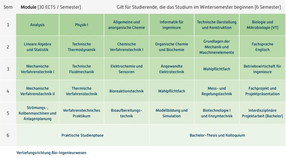 Basierend auf einer interdisziplinären Anwendung von Ingenieur- und Naturwissenschaften erwerben die Studierenden Grundlagen u.a. auf den Gebieten der Verfahrenstechnik (chemische, thermische und mechanische), der Anlagenplanung, der Mess- und Regelungstechnik sowie in Mathematik, Physik, Chemie und Biologie. Komplettiert werden die Kenntnisse durch eine weiterführende Spezialisierung in den Vertiefungsrichtungen Bio-Ingenieurwesen und Prozess-Ingenieurwesen.