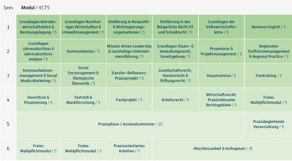 Als Basis werden im Lehrplan eine Fülle grundlegender, fachlicher und methodischer Kompetenzen in den Bereichen Betriebswirtschaftslehre und Recht vermittelt. Der Fächerkanon umfasst nachhaltigkeitsorientiertes Wirtschaften, Management und Führung von Nonprofit- und Nichtregierungsorganisationen, Wirtschafts- und Gesellschaftsrecht, Fundraising, Campaigning, Nonprofit-Jahresabschlüsse, Kommunikation uvm. Auch Fragen zur regionalökonomischen Entwicklung, zur Finanzierung und Außenkommunikation von Nichtregierungsinstitutionen oder etwa kommunales Klimamanagement werden, auch zum Teil in englischer Sprache, aufbereitet.