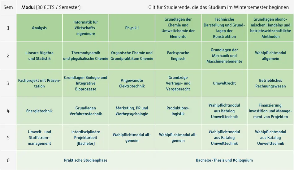 Ziel des Studienganges ist es, Wirtschaftsingenieure/innen auszubilden, die auf der Basis eines interdisziplinär geprägten Denkens, verbunden mit Kompetenzen im Umweltmanagement, Green Engineering, ökologischer Bewertung und nachhaltiger Energieversorgung, die Industriewelt im Sinne einer nachhaltigen Entwicklung strukturieren. Der Studiengang bietet eine anwendungsorientierte Ausbildung für eine qualifizierte berufspraktische Tätigkeit an der Schnittstelle zwischen Wirtschaft und Technik.