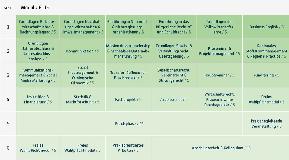 Als Basis werden im Lehrplan eine Fülle grundlegender, fachlicher und methodischer Kompetenzen in den Bereichen Betriebswirtschaftslehre und Recht vermittelt. Der Fächerkanon umfasst nachhaltigkeitsorientiertes Wirtschaften, Management und Führung von Nonprofit- und Nichtregierungsorganisationen, Wirtschafts- und Gesellschaftsrecht, Fundraising, Campaigning, Nonprofit-Jahresabschlüsse, Kommunikation uvm. Auch Fragen zur regionalökonomischen Entwicklung, zur Finanzierung und Außenkommunikation von Nichtregierungsinstitutionen oder etwa kommunales Klimamanagement werden, auch zum Teil in englischer Sprache, aufbereitet.