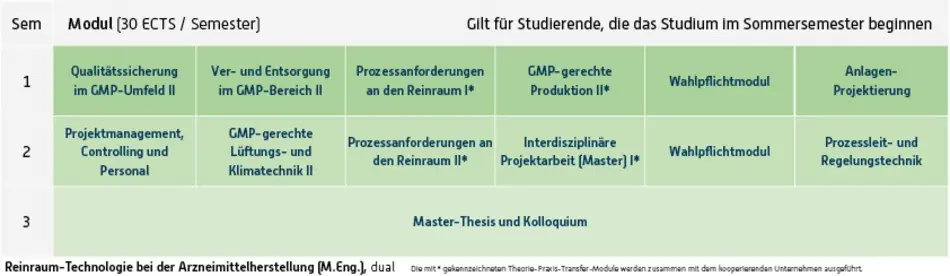 Der Start des neuen, praxisintegrierenden Master-Studiengangs "Reinraum-Technologie bei der Arzneimittelproduktion - dual (M. Eng.)" erfolgt etwas versetzt zum Start des Bachelor-Studiengangs "Biopharmazeutische Arzneimittelproduktion - dual (B. Eng.)" und ist für das Sommersemester 2025 vorgesehen.