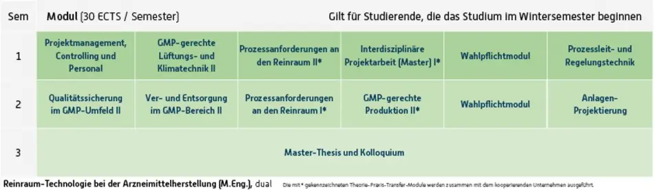 Der konsekutive Master-Studiengang „Reinraum-Technologie bei der Arzneimittelherstellung (M. Eng.)“ baut auf den Studiengängen "Biopharmazeutische Arzneimittelherstellung (B. Eng.)" und "Biopharmazeutische Arzneimittelherstellung - dual (B. Eng.)" mit 210 ECTS-Punkten auf. Er ist aufgrund der Konsekutivität 3-semestrig ausgelegt. Ein Quereinstieg über andere Bachelor-Studiengänge ist aber ebenso möglich. Wem ECTS-Punkte fehlen, weil der eigene Bachelor-Abschluss nur 180 ECTS-Punkte aufweist, kann diese Lücke durch das Besuchen von Modulen mit zusammen 30 ECTS-Punkten der beiden oben genannten Bachelor-Studiengänge sehr sinnvoll füllen. Der Master-Studiengang „Reinraum-Technologie bei der Arzneimittelherstellung (M. Eng.)“ fokussiert ganz auf Module, die sich mit den gesetzlichen Anforderungen an die Arzneimittelherstellung und an die dazu notwendigen Reinräume befassen. Ein wichtiger – vom US-amerikanischen Arzneibuch abgeleiteter – Fachbegriff dabei ist Good Manufacturing Practice (GMP), so dass die entsprechenden Module daher fast immer das Kürzel GMP im Namen tragen. Diese werden ergänzt durch einzelne Module des Pflicht- und Wahlpflichtbereichs, die sich mit dem biopharmazeutischen Herstellungsprozess auf Master-Niveau beschäftigen („Prozess-Wissen“). Im interdisziplinären Studienkonzept werden die Themen "GMP" und "Prozess-Wissen" aber auch direkt in den Modulen miteinander verknüpft. So wird das Zusammenspiel z. B. in den Modulen "Prozessanforderungen an den Reinraum I" und "Prozessanforderungen an den Reinraum II" in Form von Fallbeispielen aus der Praxis vermittelt.