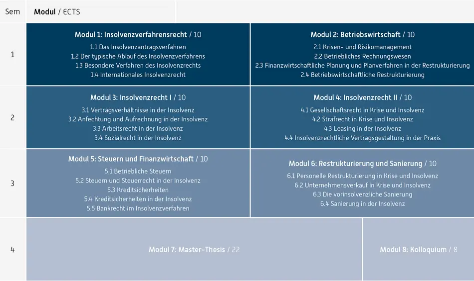 Neben Kenntnissen über die Einleitungsvoraussetzungen eines Insolvenzverfahrens und dessen typischen Ablauf von Verfahrenseröffnung bis zur Aufhebung, lernen die Studierenden im ersten Semester die besonderen Verfahrensarten der Insolvenzordnung sowie die Zuständigkeiten bei grenzüberschreitenden Insolvenzverfahren kennen. Überdies erwerben die Studierenden betriebswirtschaftliche Grundlagen zur Buchführung, Bilanzierung, Bewertung, Rechnungslegung und Kostenrechnung sowie Kenntnisse über Analysemethoden zur Krisenerkennung und Sanierungsstrategien. Daneben werden Relevanz und Schnittstellen betriebswirtschaftlicher und steuerrechtlicher Fragestellungen im Bereich insolvenzrechtlicher Sanierungsinstrumente vermittelt und die haftungsrechtlichen Konsequenzen einer gescheiterten Fortführung behandelt.
