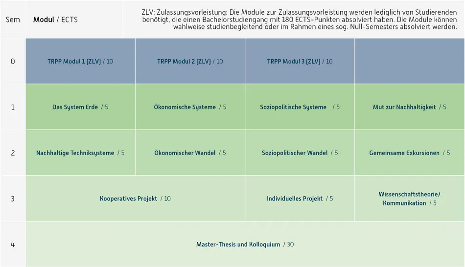 Das Studium vermittelt einen Überblick über Grundlagen der Nachhaltigkeit aus den verschiedensten Perspektiven. Dabei sollen problemorientierte Zugänge zu den diversen Bereichen eröffnet werden (Problemlösungskompetenz).