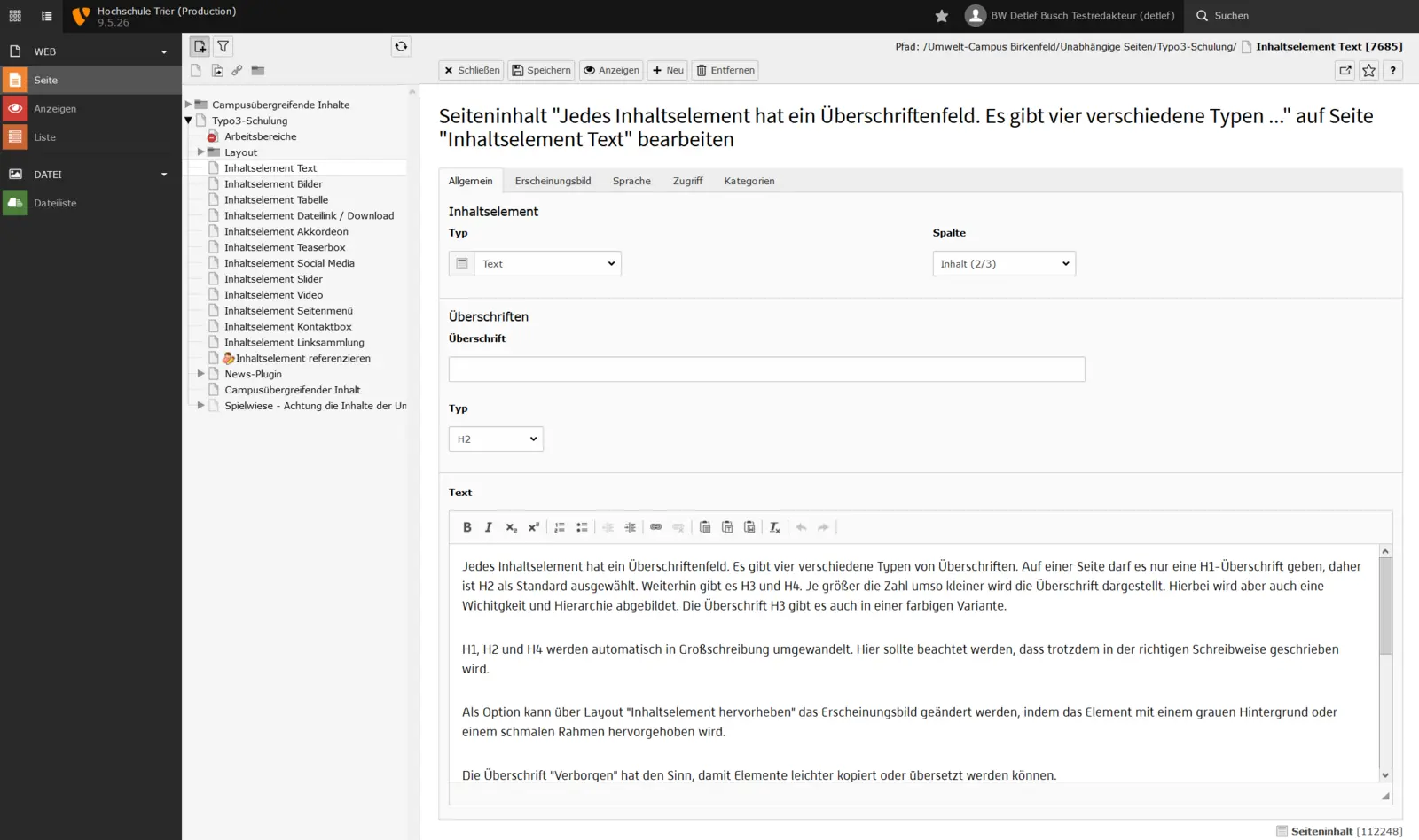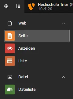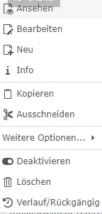 Wird im Seitenbaum ein Element mit der rechten Maustaste angeklickt, öffnet sich ein Kontextmenü mit Funktionen und Befehlen zu dem jeweiligen Element. So ist es möglich direkt ein Element anzuzeigen, zu (de-)aktivieren und zu bearbeiten.