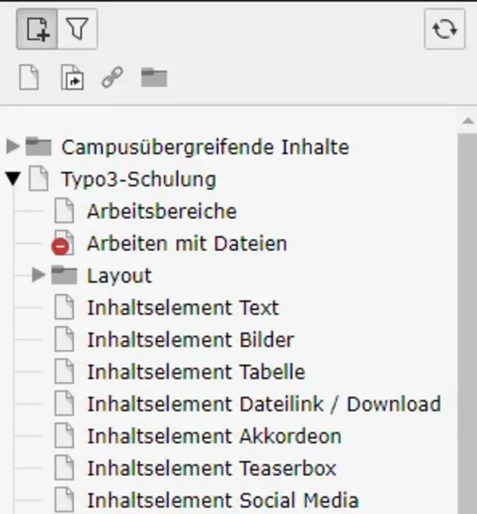 Über den Filter kann im Seitenbaum gesucht werden. Z.B. auch um bei bekannter Seiten-Id direkt eine Seite auszuwählen.