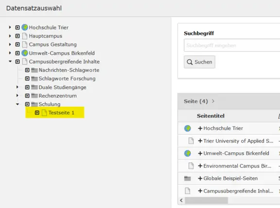 Die zentralen Seiten liegen im Seitenbaum in Ihrem Ordner unter "Campusübergreifende Inhalte". Dieser wird von einem Administrator für Sie eingerichtet und freigegeben.