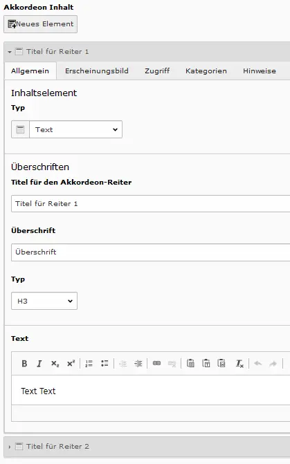Die Überschrift innerhalb des Akkordeon-Elementes ist optional. Der Text kann wie gewohnt über den Rich-Text-Editor bearbeitet werden.