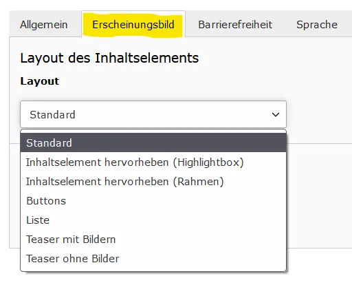 Die angezeigten Optionen "Standard" und "Inhaltselement hervorheben ..." beziehen sich auf das Listen-Layout, das entsprechend normal oder hervorgehoben dargestellt wird.