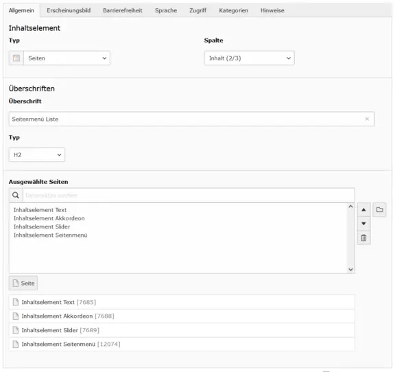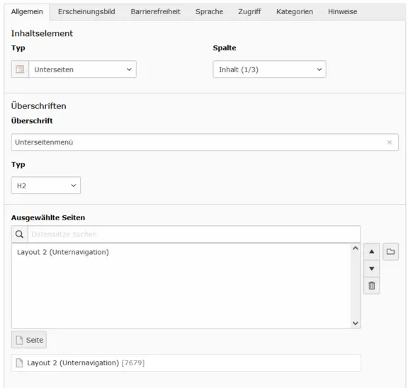 die gewünschten Seite deren Unterseiten angezeigt werden soll über den Elementbrowser ausgewählen.