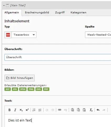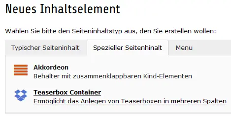 Hier können mit dem Button "Neues Element" beliebig viele Teaserboxen platziert werden.