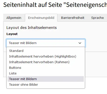 In den Einstellungen des Inhaltselementes muss unter Erscheinungsbild das Layout "Teaser mit Bildern" ausgewählt werden.