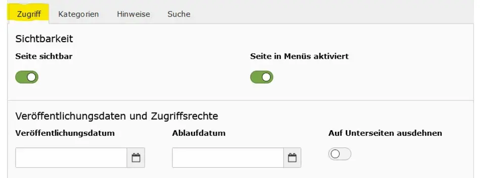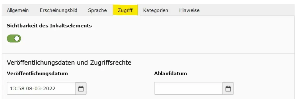 Hierzu in den Seiteneinstellungen oder im Inhaltselement den Reiter "Zugriff" auswählen. Sowohl eine ganze Seite als auch einzelne Inhaltselemente können sichtbar oder unsichtbar geschaltet werden.