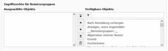 Sollen Seiten oder Inhalte nur bestimmten Nutzergruppen der Hochschule zur Verfügung gestellt werden, so kann dies über die Auswahl der jeweiligen Gruppe(n) im rechten Feld getan werden. Ausgewählte Gruppen werden in das linke Feld übertragen.